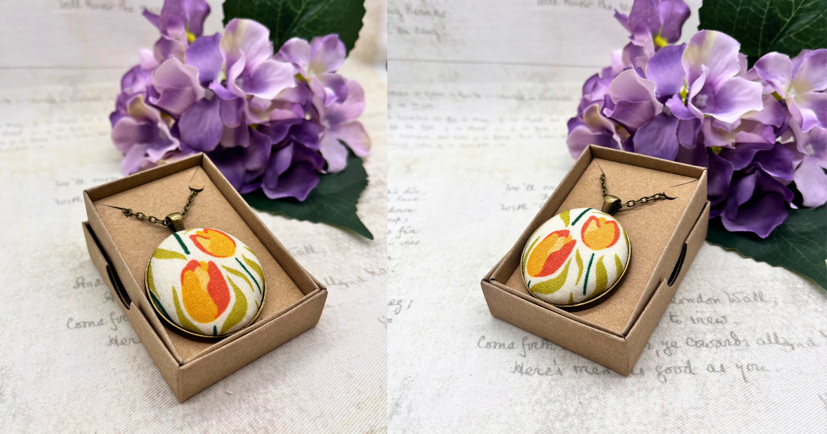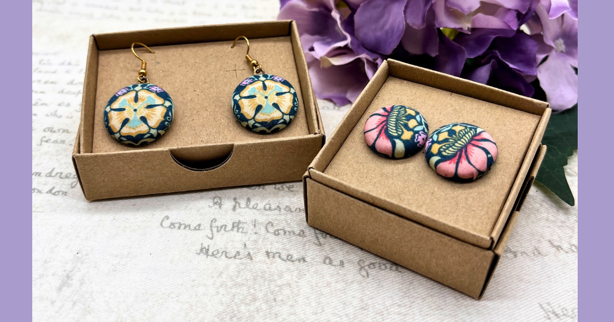 Each piece is handcrafted using my signature fabric button technique, or hand-cut fabric-covered wooden shapes that I carefully seal to make them water-resistant and practical for everyday wear. Because I work with vintage and donated fabric scraps gifted by other makers, no two pieces are ever quite the same – even within the same design, each one has its own individual character.